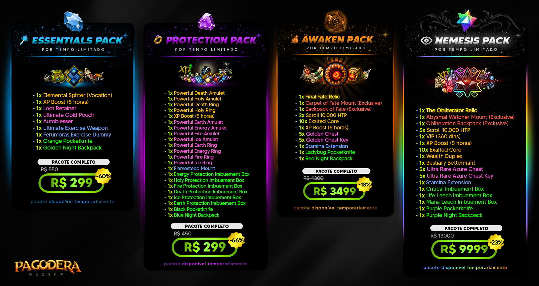 Cada pack oferece benefícios únicos, itens exclusivos e descontos especiais, válidos somente durante o período mencionado.